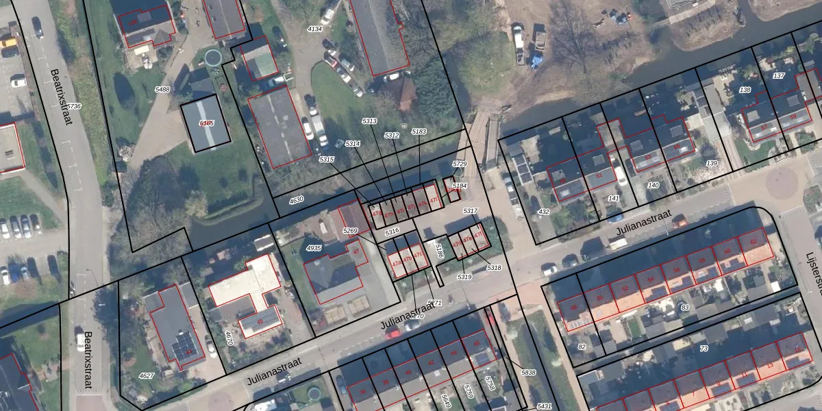 Het perceel waarop Julianastraat 47-j staat heeft een oppervlakte van 17 m². Dit is een klein perceel. De perceeloppervlakte wordt geregistreerd door het Kadaster. Gedetailleerde informatie over de maten van dit perceel kunt u vinden in het rapport Kadastrale kaart met maatvoering van Julianastraat 47-j.