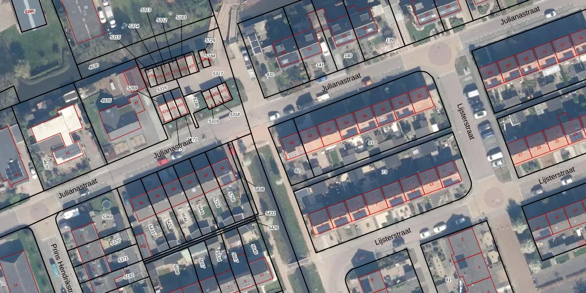 Het perceel waarop Julianastraat 48 staat heeft een oppervlakte van 188 m². Dit is een middelgroot perceel. De perceeloppervlakte wordt geregistreerd door het Kadaster. Gedetailleerde informatie over de maten van dit perceel kunt u vinden in het rapport Kadastrale kaart met maatvoering van Julianastraat 48.