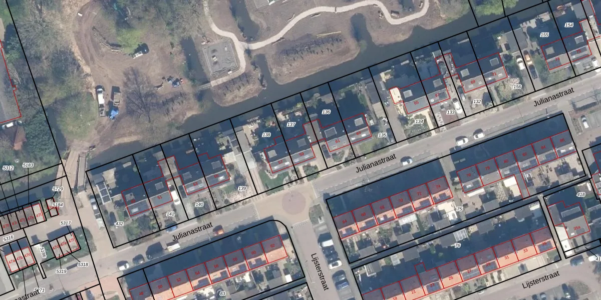 Het perceel waarop Julianastraat 59 staat heeft een oppervlakte van 275 m². Dit is een middelgroot perceel. De perceeloppervlakte wordt geregistreerd door het Kadaster. Gedetailleerde informatie over de maten van dit perceel kunt u vinden in het rapport Kadastrale kaart met maatvoering van Julianastraat 59.