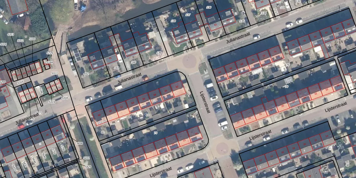 Het perceel waarop Julianastraat 62 staat heeft een oppervlakte van 1058 m². Dit is een zeer groot perceel. De perceeloppervlakte wordt geregistreerd door het Kadaster. Gedetailleerde informatie over de maten van dit perceel kunt u vinden in het rapport Kadastrale kaart met maatvoering van Julianastraat 62.
