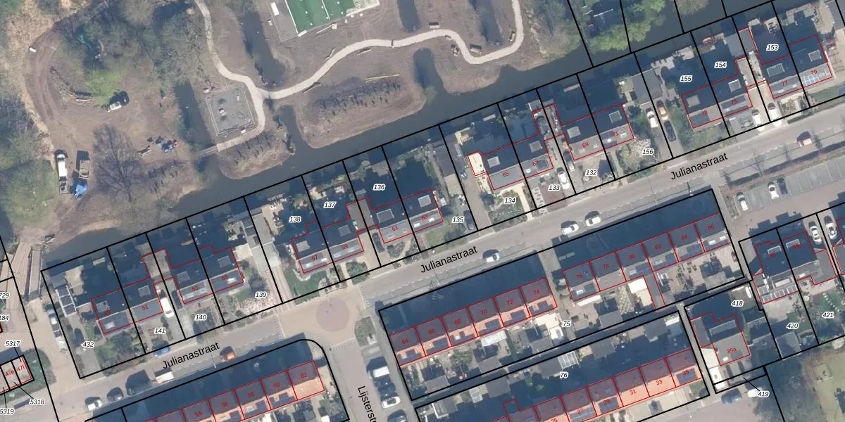 Het perceel waarop Julianastraat 63 staat heeft een oppervlakte van 390 m². Dit is een groot perceel. De perceeloppervlakte wordt geregistreerd door het Kadaster. Gedetailleerde informatie over de maten van dit perceel kunt u vinden in het rapport Kadastrale kaart met maatvoering van Julianastraat 63.
