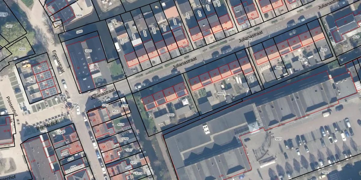 Het perceel waarop Julianastraat 8 staat heeft een oppervlakte van 763 m². Dit is een groot perceel. De perceeloppervlakte wordt geregistreerd door het Kadaster. Gedetailleerde informatie over de maten van dit perceel kunt u vinden in het rapport Kadastrale kaart met maatvoering van Julianastraat 8.