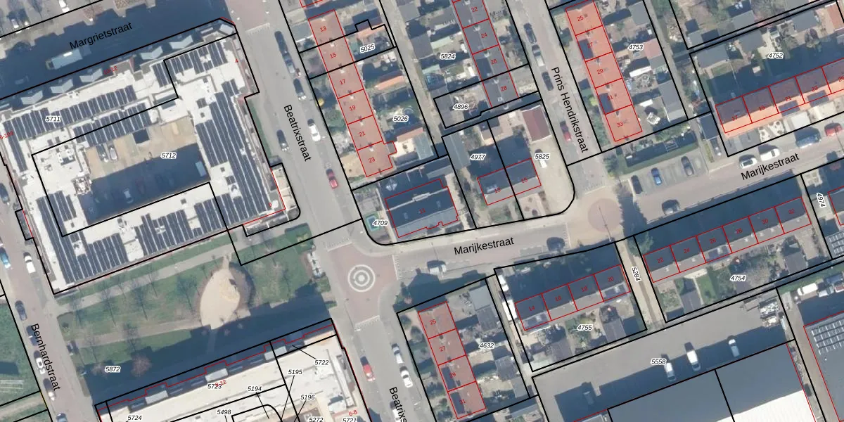 Het perceel waarop Marijkestraat 11 staat heeft een oppervlakte van 430 m². Dit is een groot perceel. De perceeloppervlakte wordt geregistreerd door het Kadaster. Gedetailleerde informatie over de maten van dit perceel kunt u vinden in het rapport Kadastrale kaart met maatvoering van Marijkestraat 11.