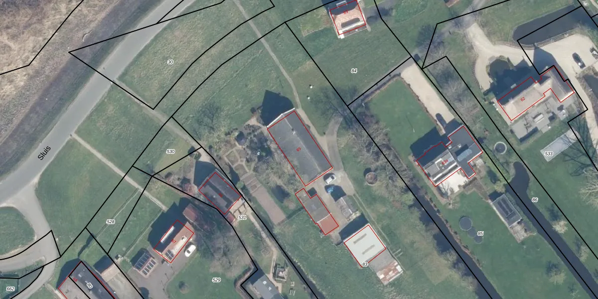 Het perceel waarop Sluis 65 staat heeft een oppervlakte van 5750 m². Dit is een zeer groot perceel. De perceeloppervlakte wordt geregistreerd door het Kadaster. Gedetailleerde informatie over de maten van dit perceel kunt u vinden in het rapport Kadastrale kaart met maatvoering van Sluis 65.