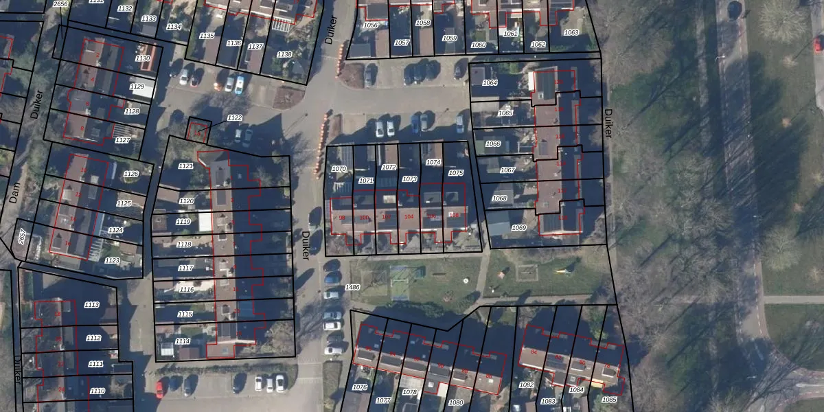 Het perceel waarop Duiker 104 staat heeft een oppervlakte van 142 m². Dit is een middelgroot perceel. De perceeloppervlakte wordt geregistreerd door het Kadaster. Gedetailleerde informatie over de maten van dit perceel kunt u vinden in het rapport Kadastrale kaart met maatvoering van Duiker 104.
