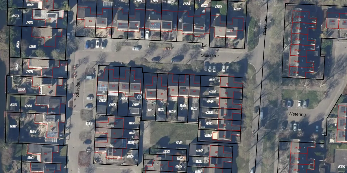 Het perceel waarop Sluisdeur 36 staat heeft een oppervlakte van 175 m². Dit is een middelgroot perceel. De perceeloppervlakte wordt geregistreerd door het Kadaster. Gedetailleerde informatie over de maten van dit perceel kunt u vinden in het rapport Kadastrale kaart met maatvoering van Sluisdeur 36.