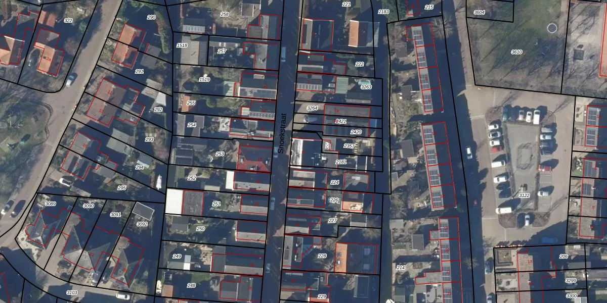 Het perceel waarop Snoekstraat 9 staat heeft een oppervlakte van 210 m². Dit is een middelgroot perceel. De perceeloppervlakte wordt geregistreerd door het Kadaster. Gedetailleerde informatie over de maten van dit perceel kunt u vinden in het rapport Kadastrale kaart met maatvoering van Snoekstraat 9.