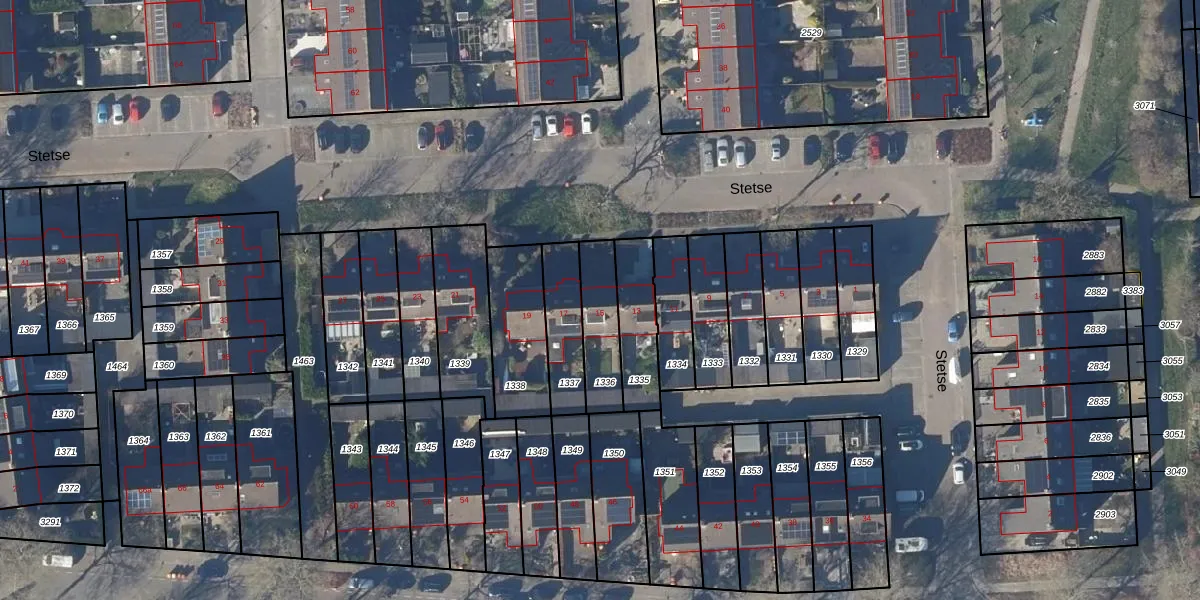 Het perceel waarop Stetse 15 staat heeft een oppervlakte van 173 m². Dit is een middelgroot perceel. De perceeloppervlakte wordt geregistreerd door het Kadaster. Gedetailleerde informatie over de maten van dit perceel kunt u vinden in het rapport Kadastrale kaart met maatvoering van Stetse 15.