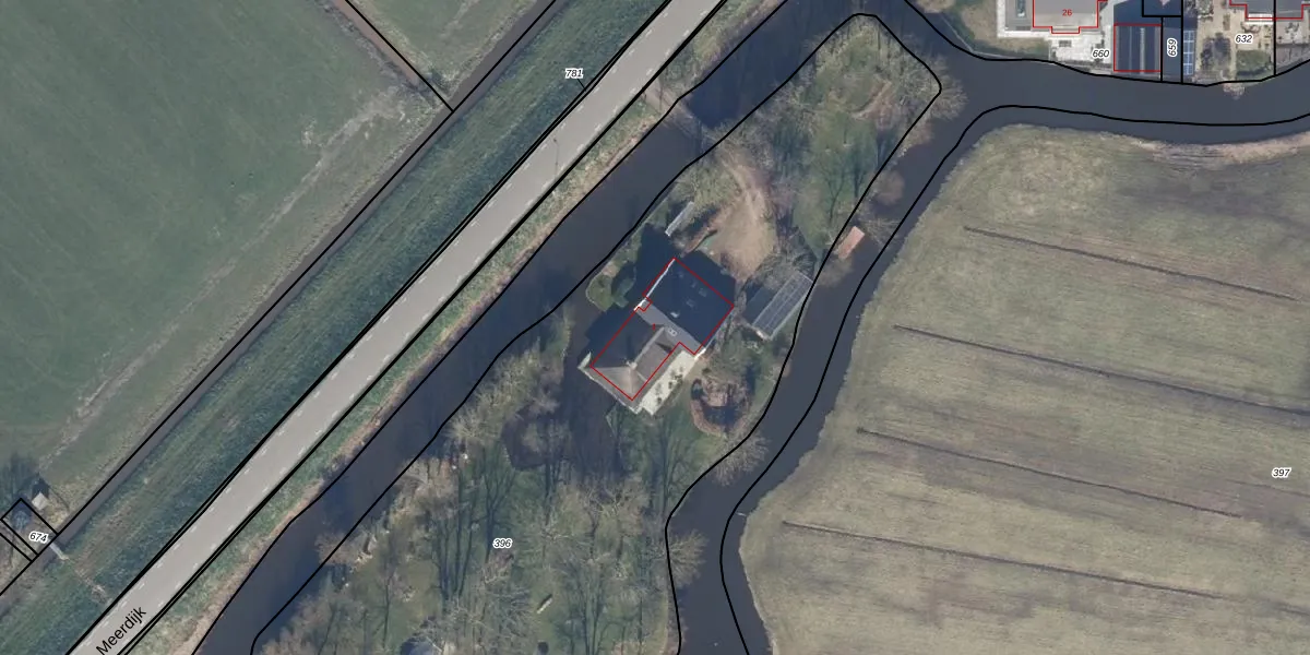 Het perceel waarop Meerdijk 1 staat heeft een oppervlakte van 4280 m². Dit is een zeer groot perceel. De perceeloppervlakte wordt geregistreerd door het Kadaster. Gedetailleerde informatie over de maten van dit perceel kunt u vinden in het rapport Kadastrale kaart met maatvoering van Meerdijk 1.