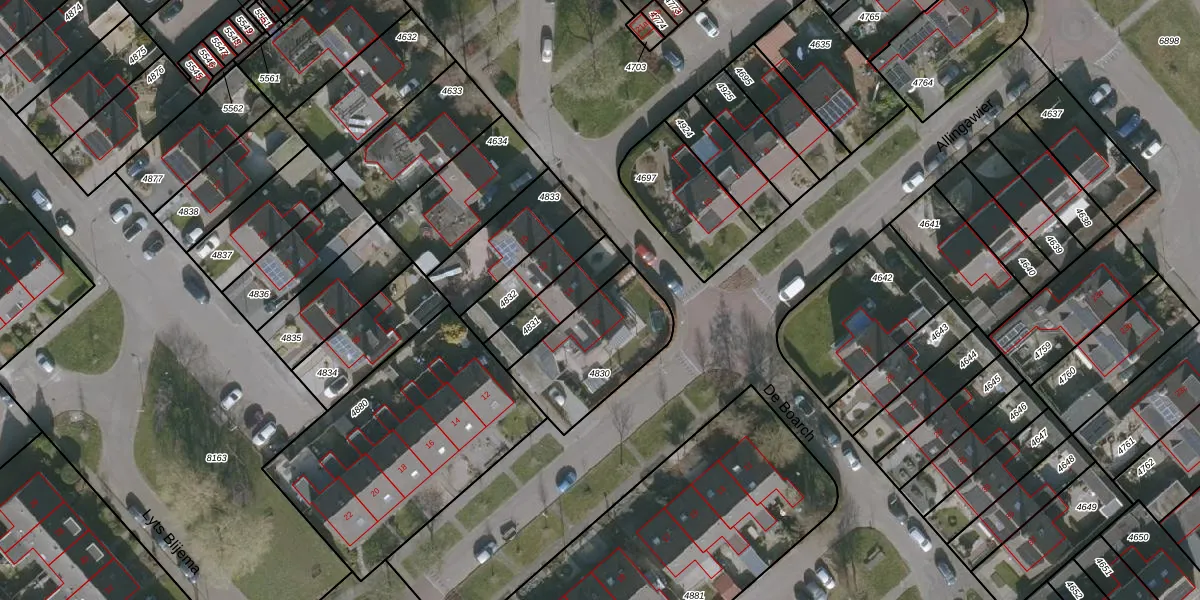 Het perceel waarop De Boarch 16 staat heeft een oppervlakte van 397 m². Dit is een groot perceel. De perceeloppervlakte wordt geregistreerd door het Kadaster. Gedetailleerde informatie over de maten van dit perceel kunt u vinden in het rapport Kadastrale kaart met maatvoering van De Boarch 16.