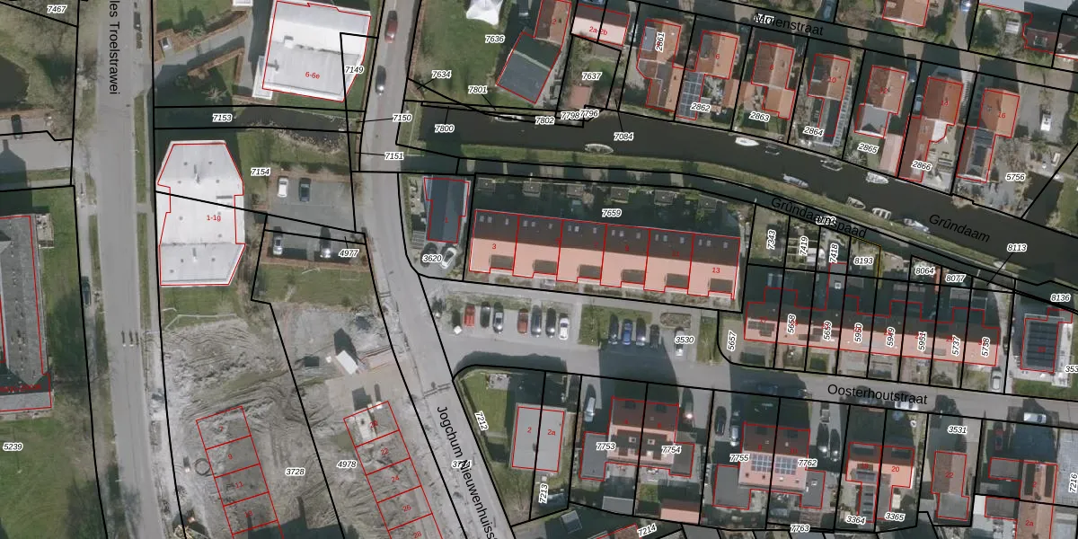 Het perceel waarop het adres ligt is GRO00-A-7659. De afkorting 'GRO00' staat voor kadastrale gemeente Grouw. De gemiddelde perceelgrootte in Grouw is 4952,13 m². Dit perceel is kleiner: de perceeloppervlakte bedraagt 1129 m². De grootste perceeloppervlakte in de kadastrale gemeente is 1,23 km². De kleinste oppervlakte bedraagt 1 m². Op het perceel zijn 6 adressen aanwezig. In de Basisregistratie Kadaster (BRK) werden de grenzen van het perceel geregistreerd op 16-07-2014.