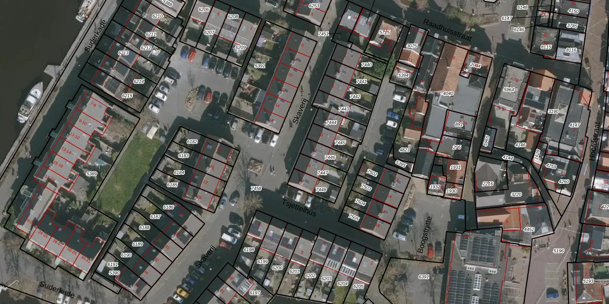 Skaverij 13 is gelegen op kadastraal perceel GRO00A7446. Deze kadastrale aanduiding is uniek en wordt gebruikt door het Kadaster om eigendomsrechten en andere zakelijke rechten vast te leggen. Het perceel maakt onderdeel uit van de kadastrale gemeente Grouw.