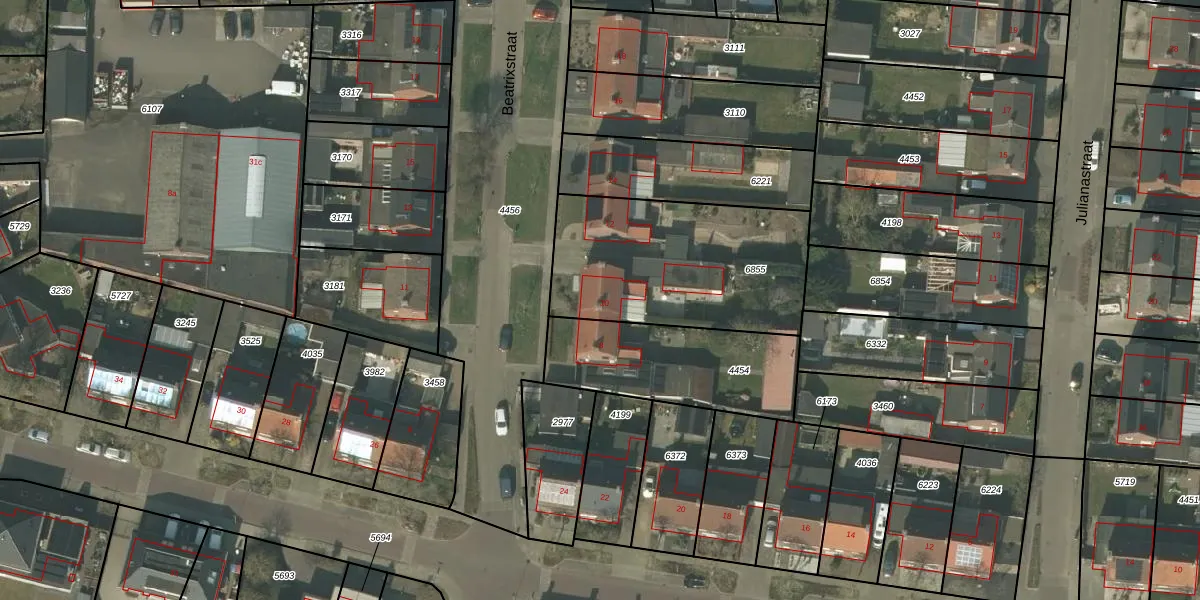 Het perceel waarop Beatrixstraat 10 staat heeft een oppervlakte van 879 m². Dit is een groot perceel. De perceeloppervlakte wordt geregistreerd door het Kadaster. Gedetailleerde informatie over de maten van dit perceel kunt u vinden in het rapport Kadastrale kaart met maatvoering van Beatrixstraat 10.