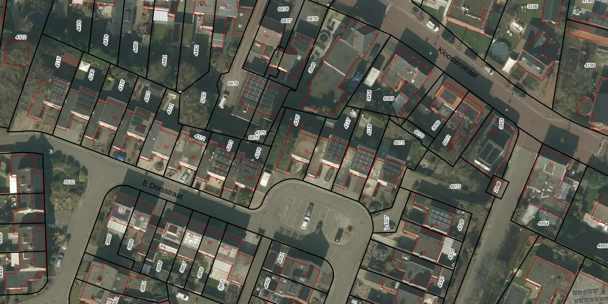 E Dorsstraat 56 is gelegen op kadastraal perceel GBV00C4325. Deze kadastrale aanduiding is uniek en wordt gebruikt door het Kadaster om eigendomsrechten en andere zakelijke rechten vast te leggen. Het perceel maakt onderdeel uit van de kadastrale gemeente Grubbenvorst.