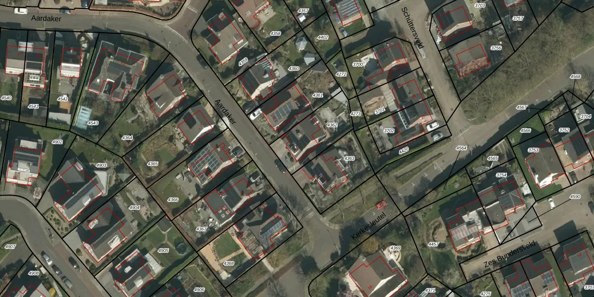 Het perceel waarop Aardaker 4 staat heeft een oppervlakte van 360 m². Dit is een groot perceel. De perceeloppervlakte wordt geregistreerd door het Kadaster. Gedetailleerde informatie over de maten van dit perceel kunt u vinden in het rapport Kadastrale kaart met maatvoering van Aardaker 4.