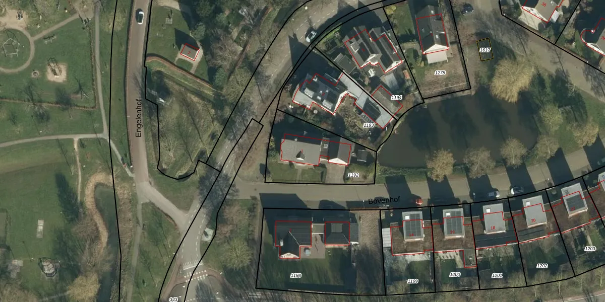 Het perceel waarop Bovenhof 1 staat heeft een oppervlakte van 637 m². Dit is een groot perceel. De perceeloppervlakte wordt geregistreerd door het Kadaster. Gedetailleerde informatie over de maten van dit perceel kunt u vinden in het rapport Kadastrale kaart met maatvoering van Bovenhof 1.
