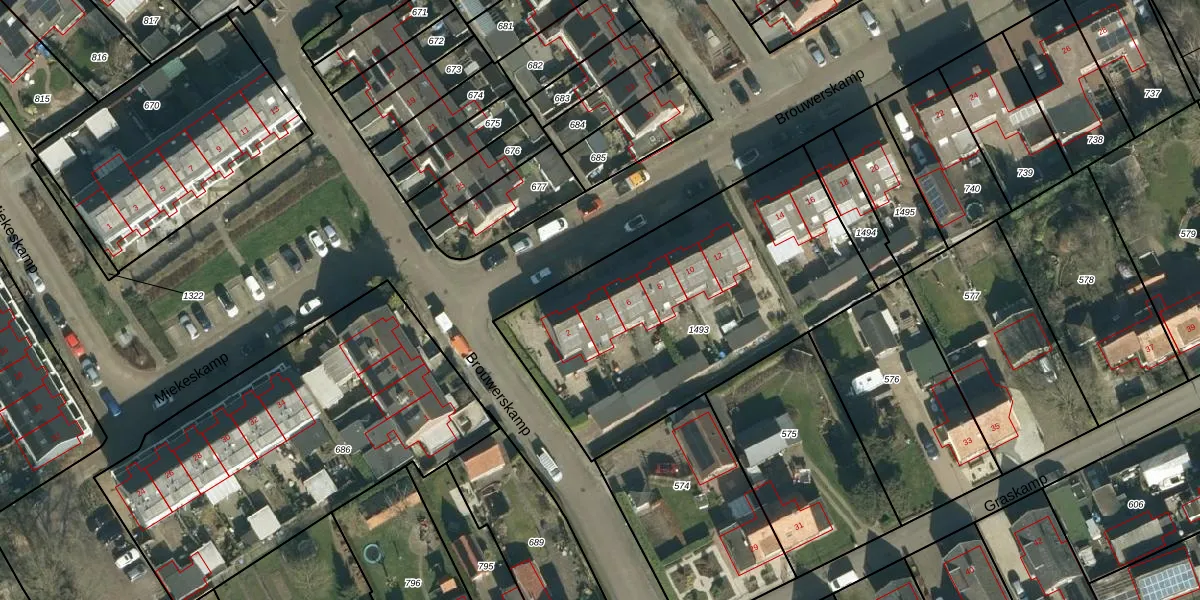 Het perceel waarop Brouwerskamp 4 staat heeft een oppervlakte van 1587 m². Dit is een zeer groot perceel. De perceeloppervlakte wordt geregistreerd door het Kadaster. Gedetailleerde informatie over de maten van dit perceel kunt u vinden in het rapport Kadastrale kaart met maatvoering van Brouwerskamp 4.