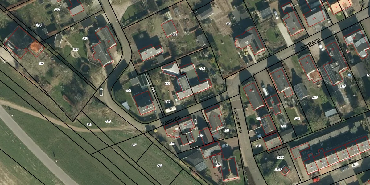 Het perceel waarop Graskamp 15 staat heeft een oppervlakte van 464 m². Dit is een groot perceel. De perceeloppervlakte wordt geregistreerd door het Kadaster. Gedetailleerde informatie over de maten van dit perceel kunt u vinden in het rapport Kadastrale kaart met maatvoering van Graskamp 15.