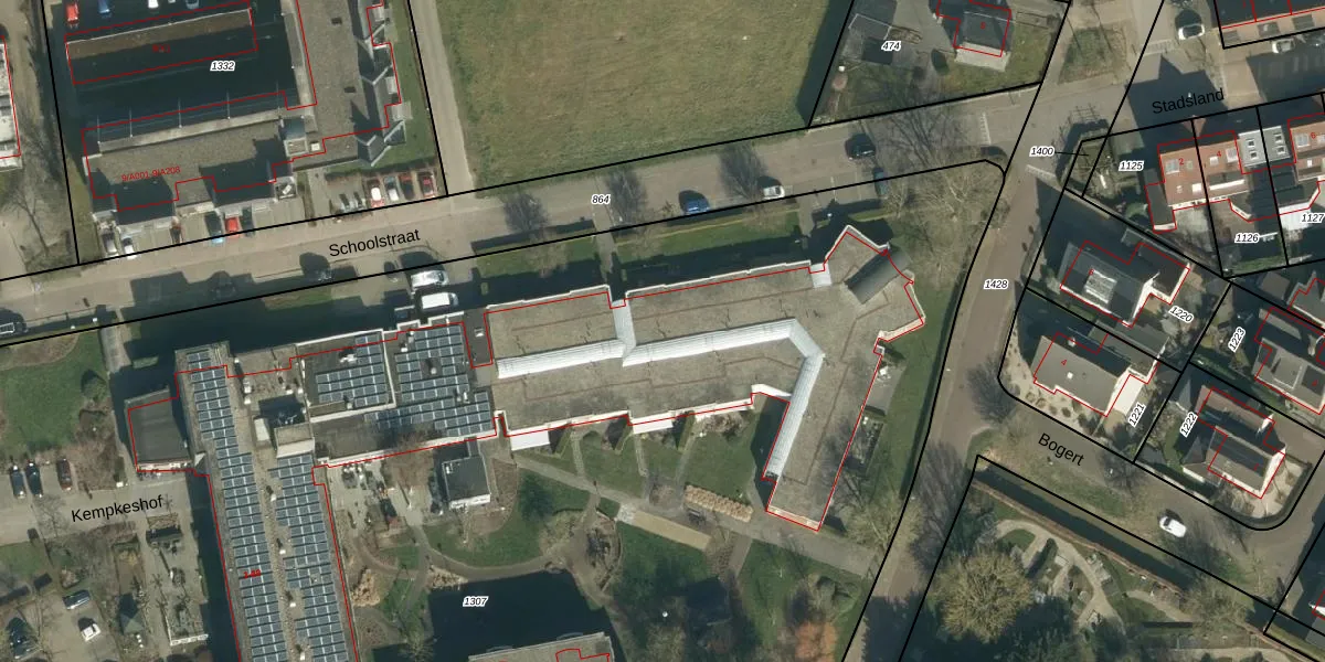 Het perceel waarop Schoolstraat 20 staat heeft een oppervlakte van 1,2 ha. Dit is een zeer groot perceel. De perceeloppervlakte wordt geregistreerd door het Kadaster. Gedetailleerde informatie over de maten van dit perceel kunt u vinden in het rapport Kadastrale kaart met maatvoering van Schoolstraat 20.