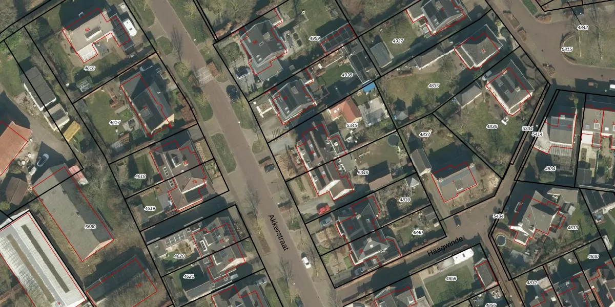 Akkerstraat 54 is gelegen op kadastraal perceel HRN02E5345. Deze kadastrale aanduiding is uniek en wordt gebruikt door het Kadaster om eigendomsrechten en andere zakelijke rechten vast te leggen. Het perceel maakt onderdeel uit van de kadastrale gemeente Haaren.