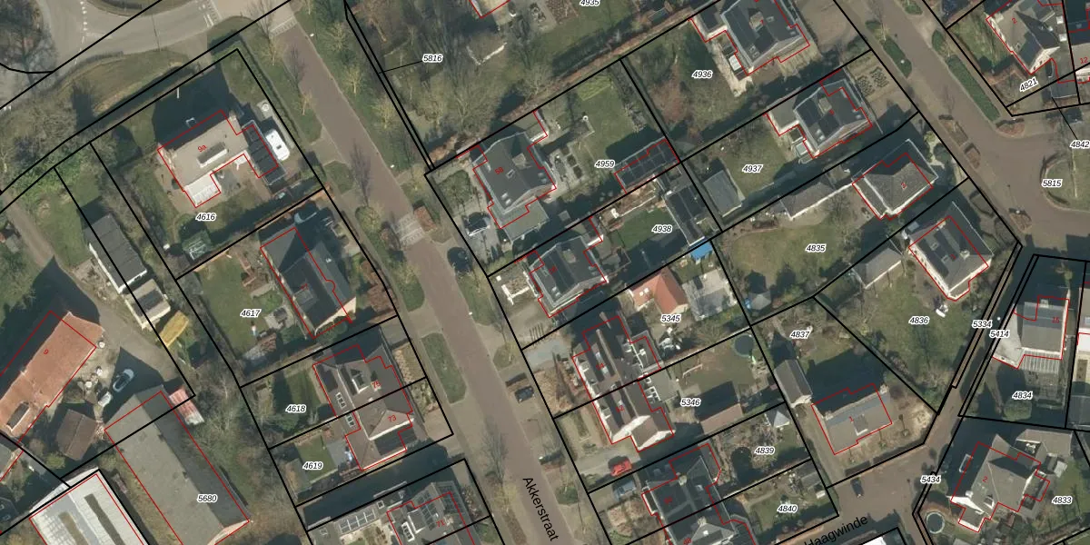 Het perceel waarop Akkerstraat 56 staat heeft een oppervlakte van 624 m². Dit is een groot perceel. De perceeloppervlakte wordt geregistreerd door het Kadaster. Gedetailleerde informatie over de maten van dit perceel kunt u vinden in het rapport Kadastrale kaart met maatvoering van Akkerstraat 56.