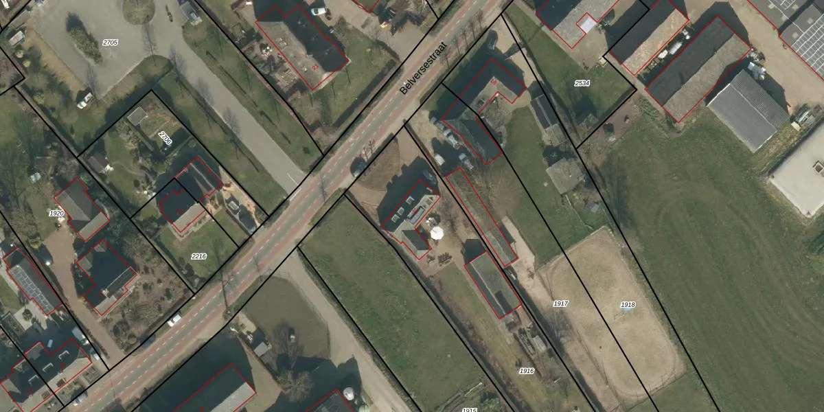Het perceel waarop Belversestraat 14 staat heeft een oppervlakte van 1985 m². Dit is een zeer groot perceel. De perceeloppervlakte wordt geregistreerd door het Kadaster. Gedetailleerde informatie over de maten van dit perceel kunt u vinden in het rapport Kadastrale kaart met maatvoering van Belversestraat 14.