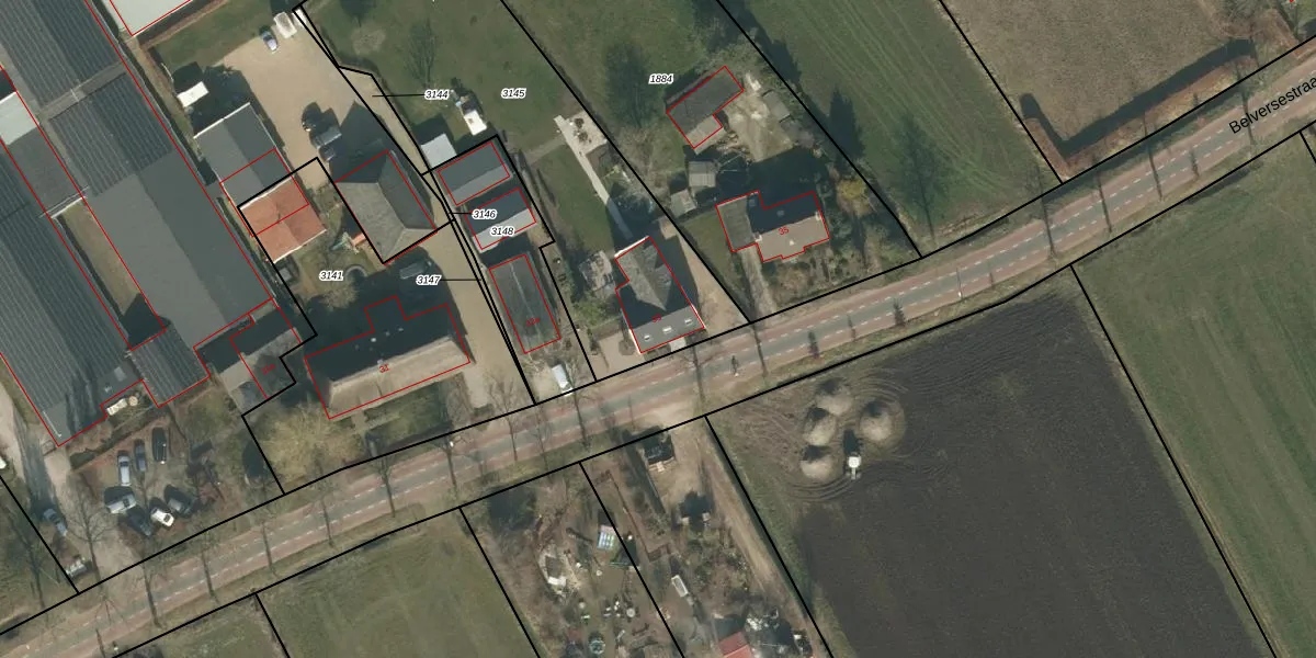 Het perceel waarop Belversestraat 33 staat heeft een oppervlakte van 1593 m². Dit is een zeer groot perceel. De perceeloppervlakte wordt geregistreerd door het Kadaster. Gedetailleerde informatie over de maten van dit perceel kunt u vinden in het rapport Kadastrale kaart met maatvoering van Belversestraat 33.