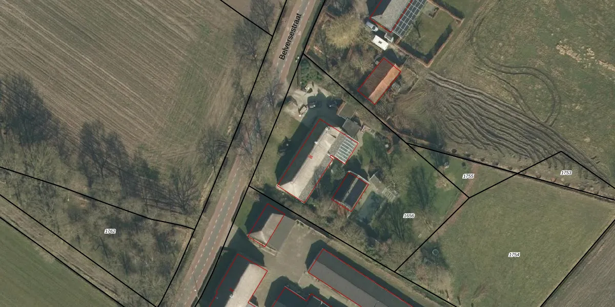 Het perceel waarop Belversestraat 36 staat heeft een oppervlakte van 2500 m². Dit is een zeer groot perceel. De perceeloppervlakte wordt geregistreerd door het Kadaster. Gedetailleerde informatie over de maten van dit perceel kunt u vinden in het rapport Kadastrale kaart met maatvoering van Belversestraat 36.