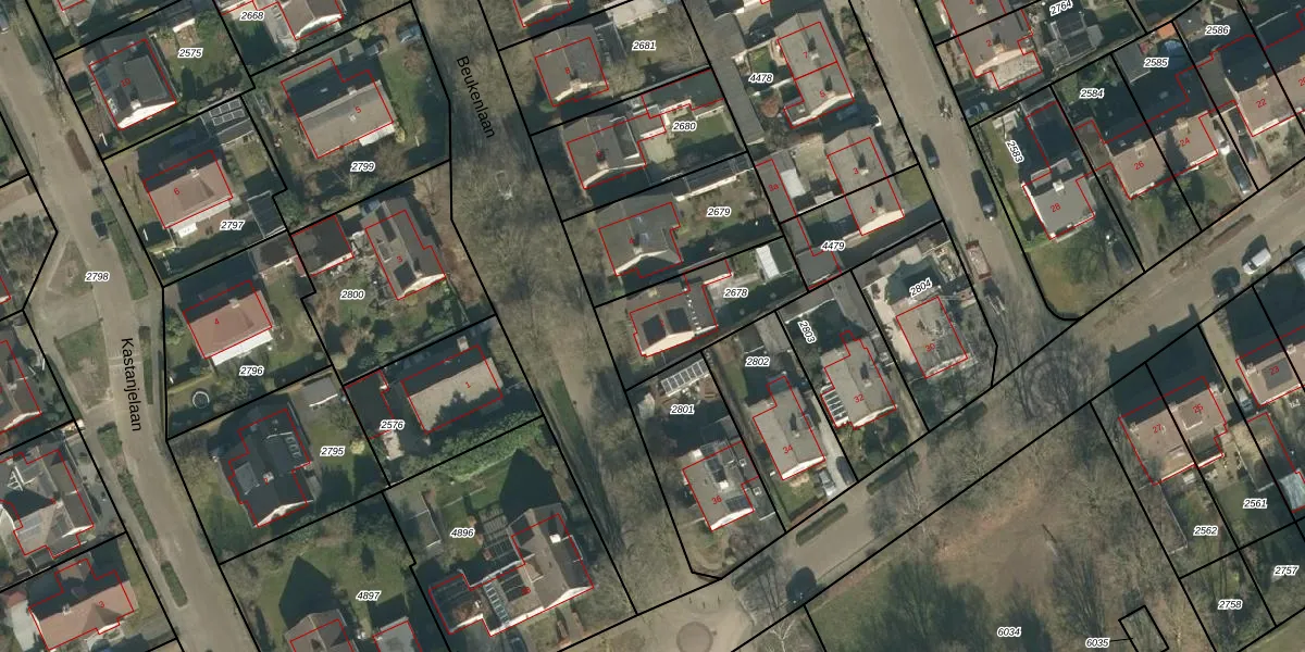 Beukenlaan 2 is gelegen op kadastraal perceel HRN02E2678. Deze kadastrale aanduiding is uniek en wordt gebruikt door het Kadaster om eigendomsrechten en andere zakelijke rechten vast te leggen. Het perceel maakt onderdeel uit van de kadastrale gemeente Haaren.