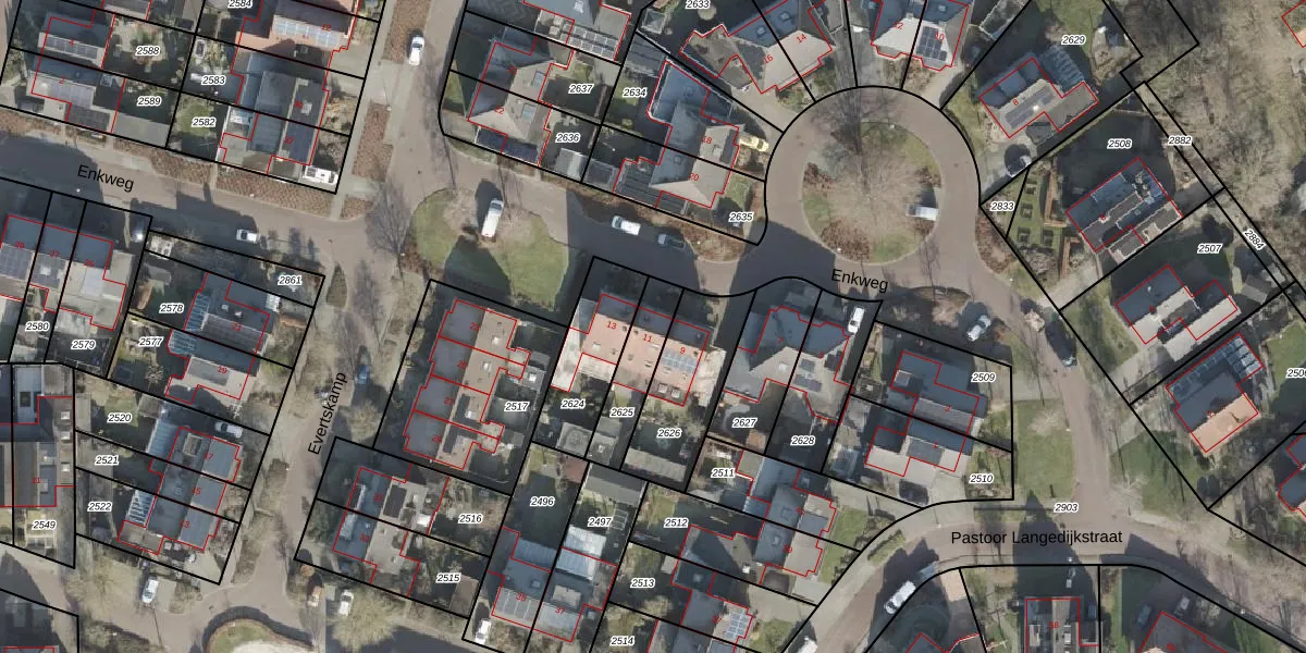Enkweg 11 is gelegen op kadastraal perceel HLD01F2625. Deze kadastrale aanduiding is uniek en wordt gebruikt door het Kadaster om eigendomsrechten en andere zakelijke rechten vast te leggen. Het perceel maakt onderdeel uit van de kadastrale gemeente Hellendoorn.