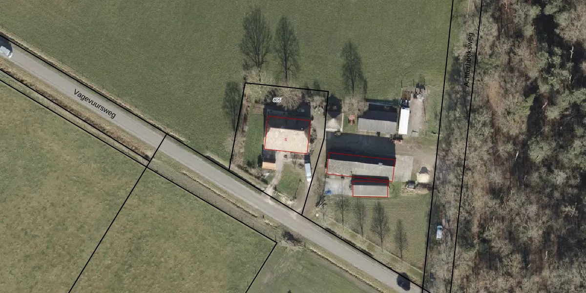 Vagevuursweg 5 is gelegen op kadastraal perceel HLD01D805. Deze kadastrale aanduiding is uniek en wordt gebruikt door het Kadaster om eigendomsrechten en andere zakelijke rechten vast te leggen. Het perceel maakt onderdeel uit van de kadastrale gemeente Hellendoorn.