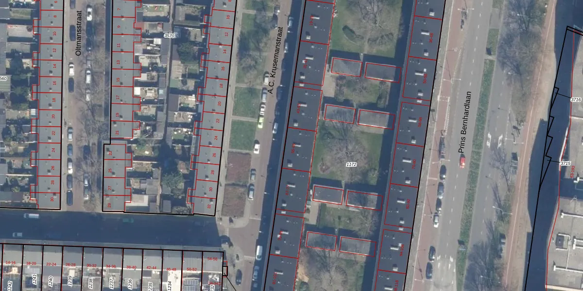 Het perceel waarop A.C. Krusemanstraat 59 staat heeft een oppervlakte van 9320 m². Dit is een zeer groot perceel. De perceeloppervlakte wordt geregistreerd door het Kadaster. Gedetailleerde informatie over de maten van dit perceel kunt u vinden in het rapport Kadastrale kaart met maatvoering van A.C. Krusemanstraat 59.