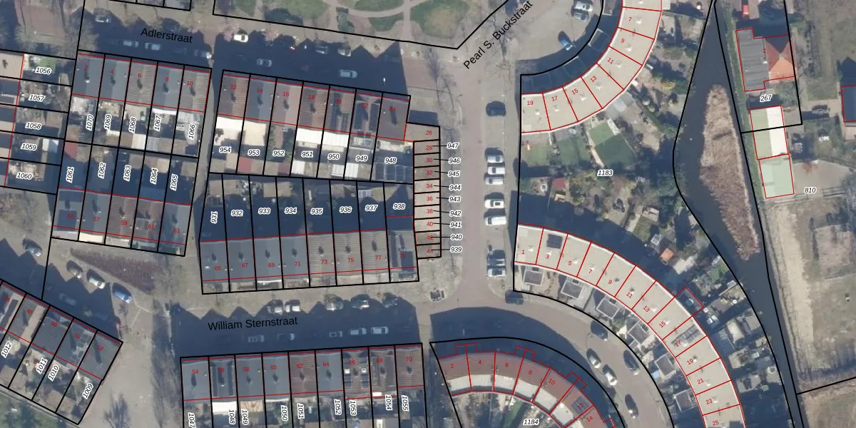 Het perceel waarop Adlerstraat 38 staat heeft een oppervlakte van 19 m². Dit is een klein perceel. De perceeloppervlakte wordt geregistreerd door het Kadaster. Gedetailleerde informatie over de maten van dit perceel kunt u vinden in het rapport Kadastrale kaart met maatvoering van Adlerstraat 38.