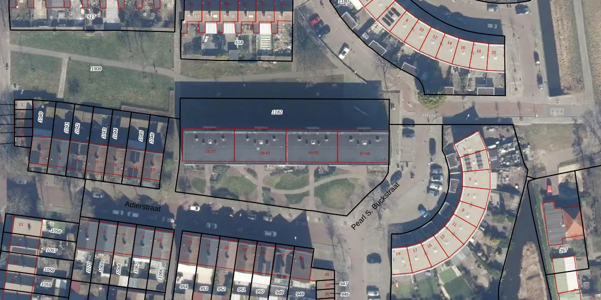 Het perceel waarop Adlerstraat 45 staat heeft een oppervlakte van 2408 m². Dit is een zeer groot perceel. De perceeloppervlakte wordt geregistreerd door het Kadaster. Gedetailleerde informatie over de maten van dit perceel kunt u vinden in het rapport Kadastrale kaart met maatvoering van Adlerstraat 45.