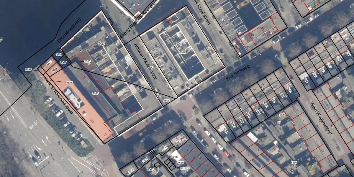 Het adres ligt op het perceel HLM01-E-6601, dat zich in de kadastrale gemeente Haarlem bevindt. De gemiddelde perceeloppervlakte in de kadastrale gemeente Haarlem is 328,33 m². Dit perceel is met zijn 1300 m² dus groter dan gemiddeld. De grootste perceeloppervlakte in de kadastrale gemeente is 13,9 ha. De kleinste oppervlakte bedraagt 0 m². Op het perceel zijn 19 adressen aanwezig. De huidige grenzen van het perceel zijn digitaal in de Basisregistratie Kadaster (BRK) geregistreerd op 09-09-2009.