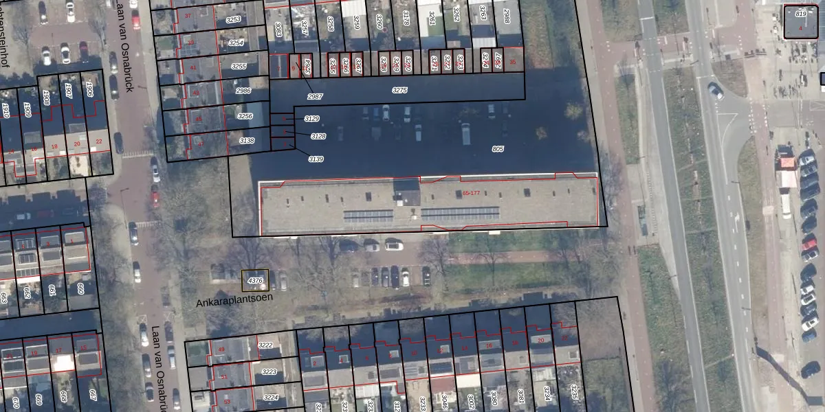 Het perceel waarop Ankaraplantsoen 65 staat heeft een oppervlakte van 3201 m². Dit is een zeer groot perceel. De perceeloppervlakte wordt geregistreerd door het Kadaster. Gedetailleerde informatie over de maten van dit perceel kunt u vinden in het rapport Kadastrale kaart met maatvoering van Ankaraplantsoen 65.