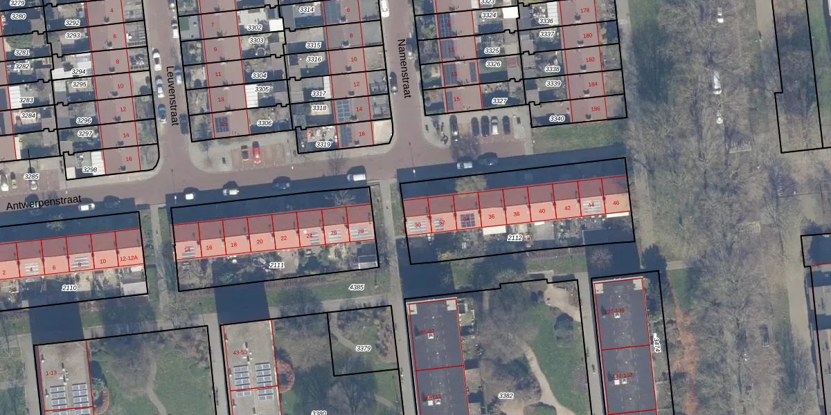 Het perceel waarop Antwerpenstraat 30 staat heeft een oppervlakte van 1090 m². Dit is een zeer groot perceel. De perceeloppervlakte wordt geregistreerd door het Kadaster. Gedetailleerde informatie over de maten van dit perceel kunt u vinden in het rapport Kadastrale kaart met maatvoering van Antwerpenstraat 30.