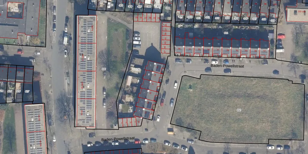 Baden-Powellstraat 19 is gelegen op kadastraal perceel HLM02X710. Deze kadastrale aanduiding is uniek en wordt gebruikt door het Kadaster om eigendomsrechten en andere zakelijke rechten vast te leggen. Het perceel maakt onderdeel uit van de kadastrale gemeente Haarlem.