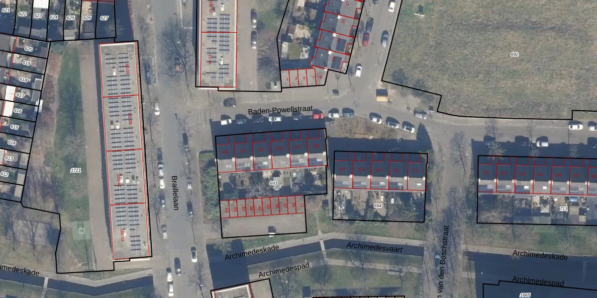 Baden-Powellstraat 231 is gelegen op kadastraal perceel HLM02X693. Deze kadastrale aanduiding is uniek en wordt gebruikt door het Kadaster om eigendomsrechten en andere zakelijke rechten vast te leggen. Het perceel maakt onderdeel uit van de kadastrale gemeente Haarlem.