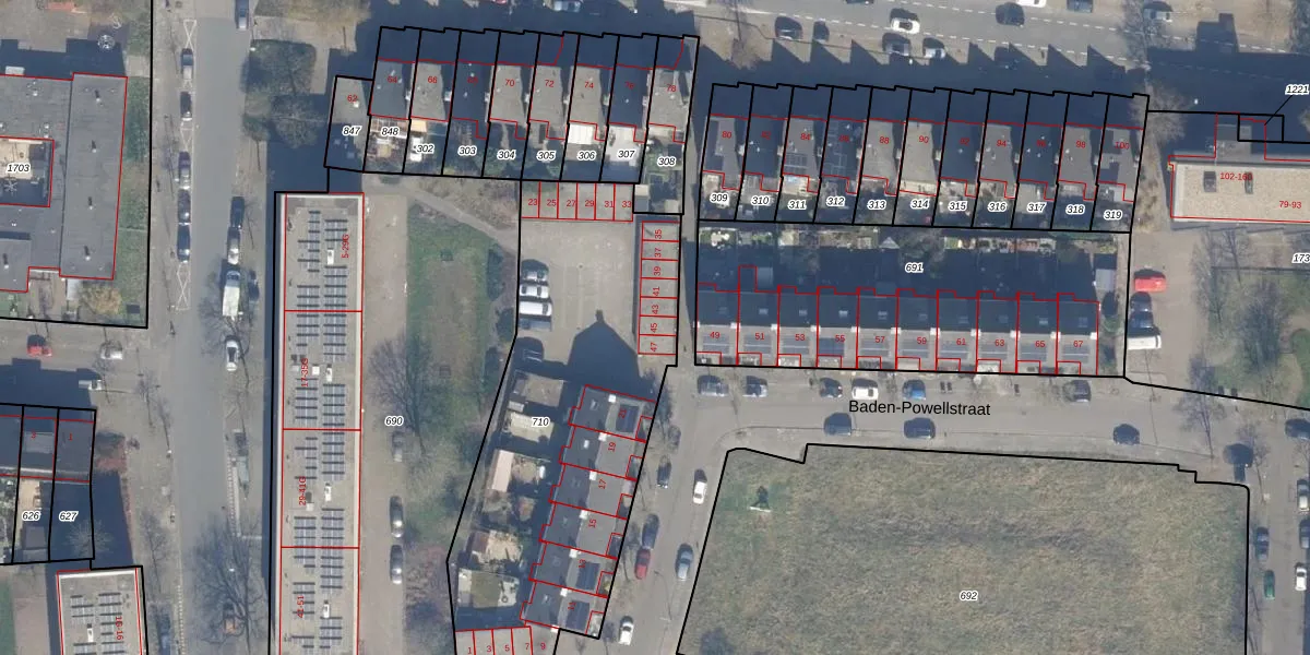 Baden-Powellstraat 45 is gelegen op kadastraal perceel HLM02X710. Deze kadastrale aanduiding is uniek en wordt gebruikt door het Kadaster om eigendomsrechten en andere zakelijke rechten vast te leggen. Het perceel maakt onderdeel uit van de kadastrale gemeente Haarlem.