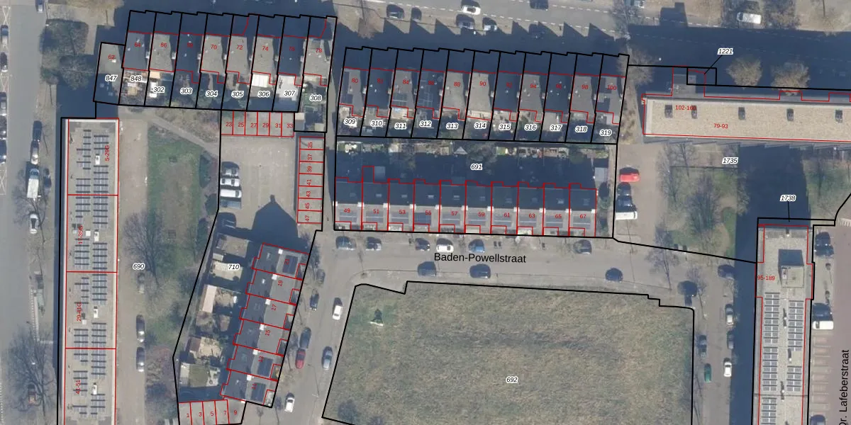 Baden-Powellstraat 55 is gelegen op kadastraal perceel HLM02X691. Deze kadastrale aanduiding is uniek en wordt gebruikt door het Kadaster om eigendomsrechten en andere zakelijke rechten vast te leggen. Het perceel maakt onderdeel uit van de kadastrale gemeente Haarlem.
