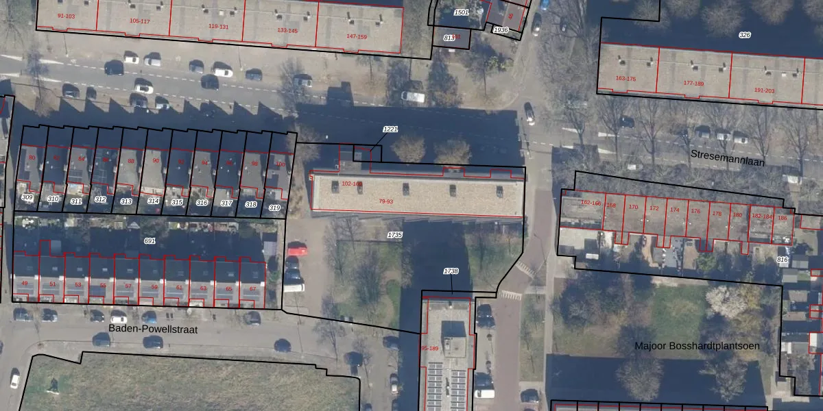 Het perceel waarop Baden-Powellstraat 81 staat heeft een oppervlakte van 2083 m². Dit is een zeer groot perceel. De perceeloppervlakte wordt geregistreerd door het Kadaster. Gedetailleerde informatie over de maten van dit perceel kunt u vinden in het rapport Kadastrale kaart met maatvoering van Baden-Powellstraat 81.