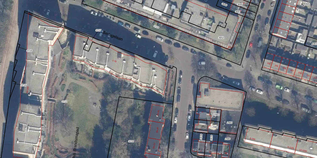 Het perceel waarop Berlagelaan 60 staat heeft een oppervlakte van 6797 m². Dit is een zeer groot perceel. De perceeloppervlakte wordt geregistreerd door het Kadaster. Gedetailleerde informatie over de maten van dit perceel kunt u vinden in het rapport Kadastrale kaart met maatvoering van Berlagelaan 60.