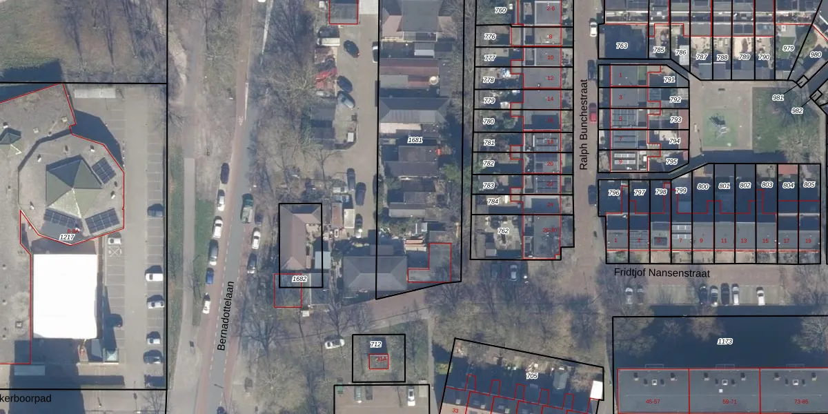Het perceel waarop Bernadottelaan 1-D staat heeft een oppervlakte van 1715 m². Dit is een zeer groot perceel. De perceeloppervlakte wordt geregistreerd door het Kadaster. Gedetailleerde informatie over de maten van dit perceel kunt u vinden in het rapport Kadastrale kaart met maatvoering van Bernadottelaan 1-D.