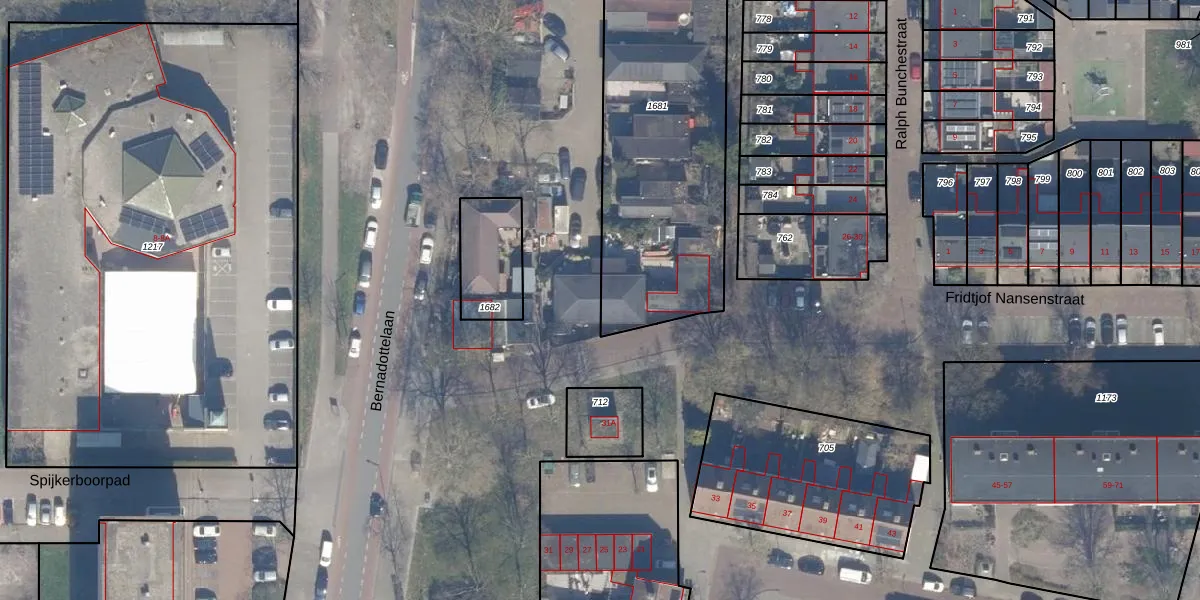 Het perceel waarop Bernadottelaan 1-E staat heeft een oppervlakte van 9,5 ha. Dit is een zeer groot perceel. De perceeloppervlakte wordt geregistreerd door het Kadaster. Gedetailleerde informatie over de maten van dit perceel kunt u vinden in het rapport Kadastrale kaart met maatvoering van Bernadottelaan 1-E.