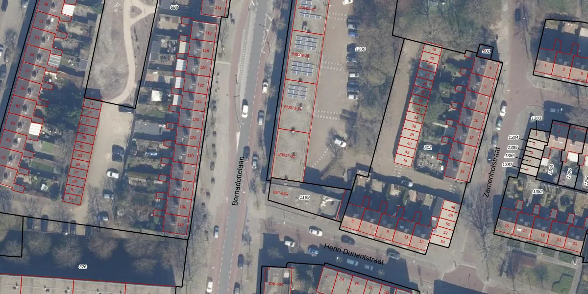 Bernadottelaan 57 is gelegen op kadastraal perceel HLM02X1200. Deze kadastrale aanduiding is uniek en wordt gebruikt door het Kadaster om eigendomsrechten en andere zakelijke rechten vast te leggen. Het perceel maakt onderdeel uit van de kadastrale gemeente Haarlem.