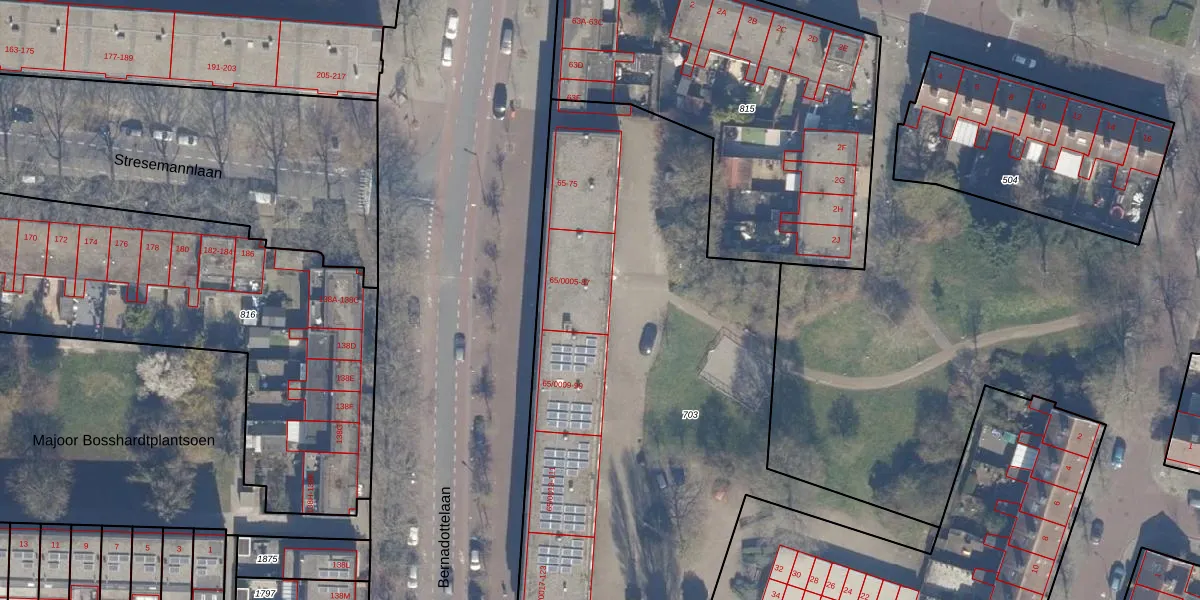 Bernadottelaan 65-0007 is gelegen op kadastraal perceel HLM02X703. Deze kadastrale aanduiding is uniek en wordt gebruikt door het Kadaster om eigendomsrechten en andere zakelijke rechten vast te leggen. Het perceel maakt onderdeel uit van de kadastrale gemeente Haarlem.