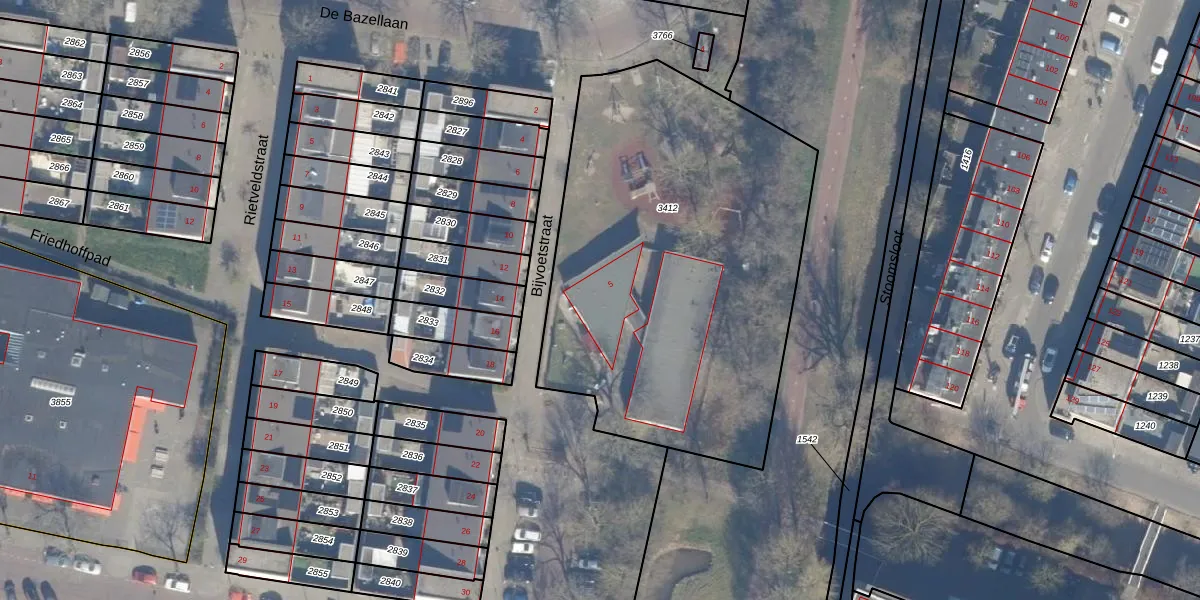 Het perceel waarop Bijvoetstraat 5 staat heeft een oppervlakte van 2315 m². Dit is een zeer groot perceel. De perceeloppervlakte wordt geregistreerd door het Kadaster. Gedetailleerde informatie over de maten van dit perceel kunt u vinden in het rapport Kadastrale kaart met maatvoering van Bijvoetstraat 5.