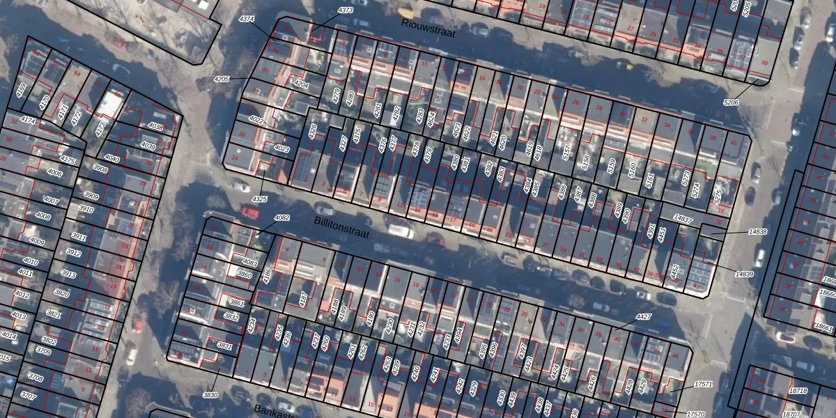 Het perceel waarop Billitonstraat 13 staat heeft een oppervlakte van 89 m². Dit is een klein perceel. De perceeloppervlakte wordt geregistreerd door het Kadaster. Gedetailleerde informatie over de maten van dit perceel kunt u vinden in het rapport Kadastrale kaart met maatvoering van Billitonstraat 13.