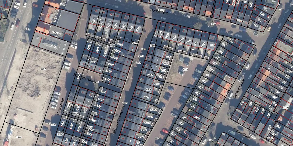 Blauwe Tramstraat 7 is gelegen op kadastraal perceel HLM02S3058. Deze kadastrale aanduiding is uniek en wordt gebruikt door het Kadaster om eigendomsrechten en andere zakelijke rechten vast te leggen. Het perceel maakt onderdeel uit van de kadastrale gemeente Haarlem.